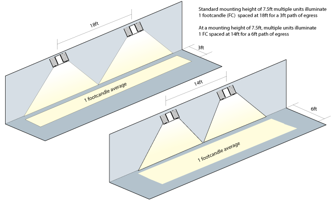 Using multiple units mounted at a typical 7.5" delivers 18" center-to center spacing on a 3" wide egress path.