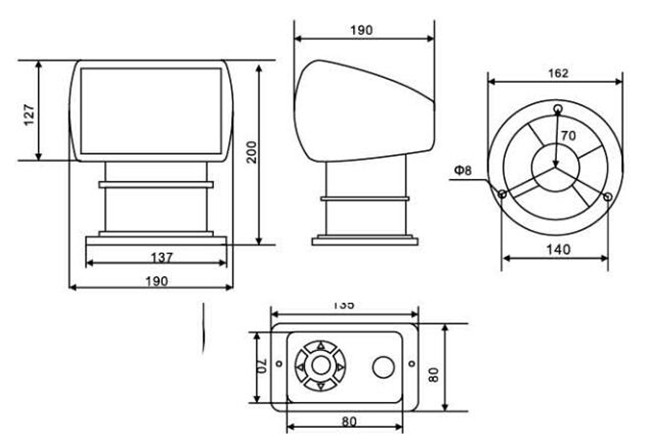 TG25-A Automatic searchlight | DC12V/24V | 100W | 3A/6A | 2.6kg | 190*180*200mm |
