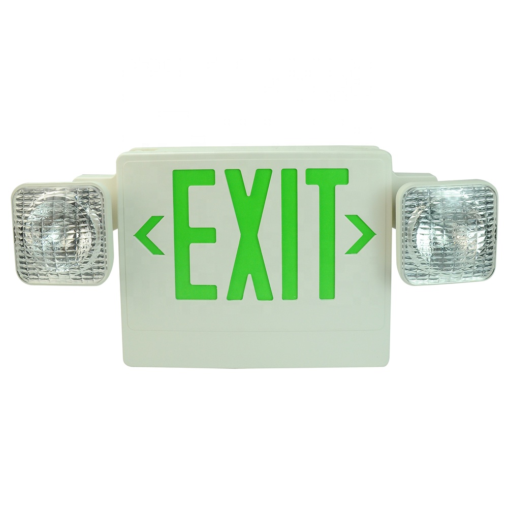 Green Compact Combo Exit Sign Emergency Lamp Single/Double Sided With Dual Head Lights Plus Back Up Battery Pack, Fire Resistant