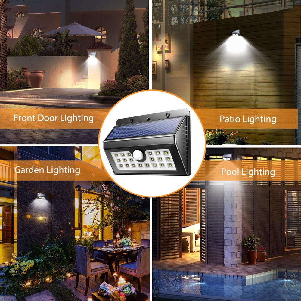 BRIGHT LED SOLAR LIGHTS It has 20 bright LED lights. Bright enough to offer excellent illumination and turn the dark space into a bright lighted space. Great detector for security, automatically turn on at night.3 INTELLIGENT ENERGY-SAVING MODES Compare with other single-mode solar lights, you can choose the perfect mode according to your diverse needs: off + super bright when motion detected; dim + super bright when motion detected; keep lighting all the night time.STURDY AND DURABLE Waterproof IP44 and amazing heat & frost resistance. Great outdoor security night light for wall, patio, garden, porch, lawn, pathway, gutter,RV etc. It"s specifically designed to withstand extreme weather conditions.Simple Installation The solar wall light outdoor can be mounted on the wall with provided screws in seconds, no cable or wire necessary.Guarantee & Warranty We attaches high importance to user experience and solar motion sensor light quality,12-month and friendly customer service.If there any issue about this solar security light, please feel free to contact us first, we"ll get it resolved as soon as.