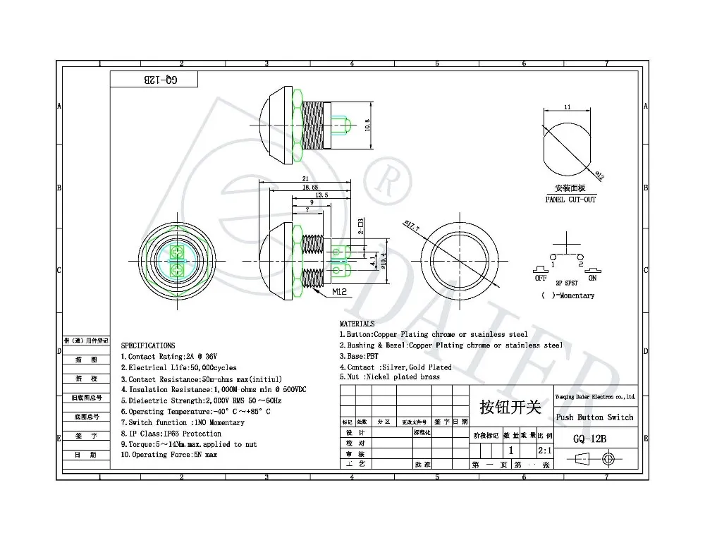 - 12mm Dome Button 2Pin SPST Momentary Metal Waterproof Explosion Proof Push Button Switch is 50pcs/box.