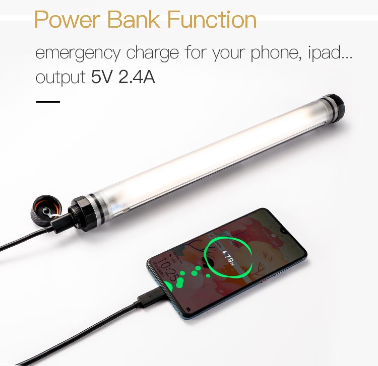 3>With high battery capability 10400mAh , it can continuously work 4.5 hours at the brightest mode. 4>Professional waterproof IP68 rating makes it can work underwater 2 meters and suitable for underwater photography and shooting.