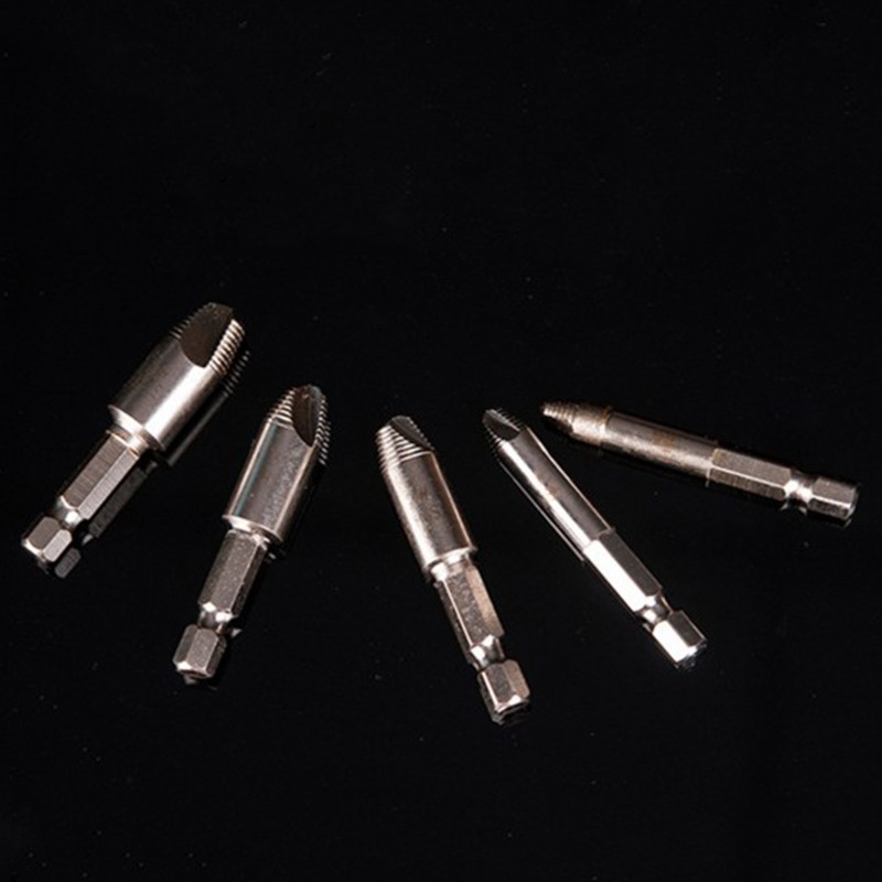 Large bit has 6-sided shank and small bits have hex shank to prevent slip in drill chuck