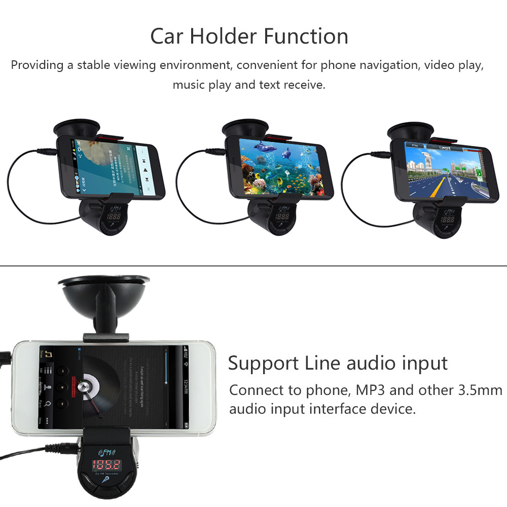 FM transmitter: Adjust the device frequency same to car radio, then voice can be easily transmit to car audio via audio line.