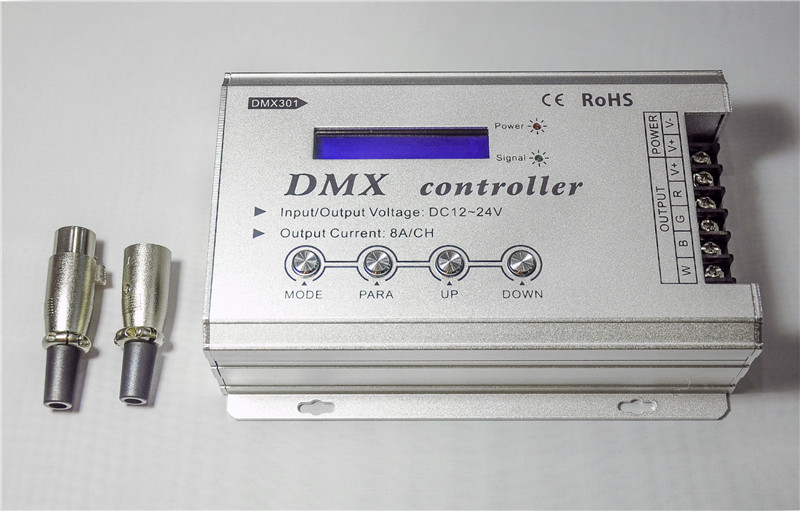 DMX301 low voltage DMX led controller (with LCD display);DC12~24V input;Output current:8A*3channels,power: 12V:<144W, 24V:<288W