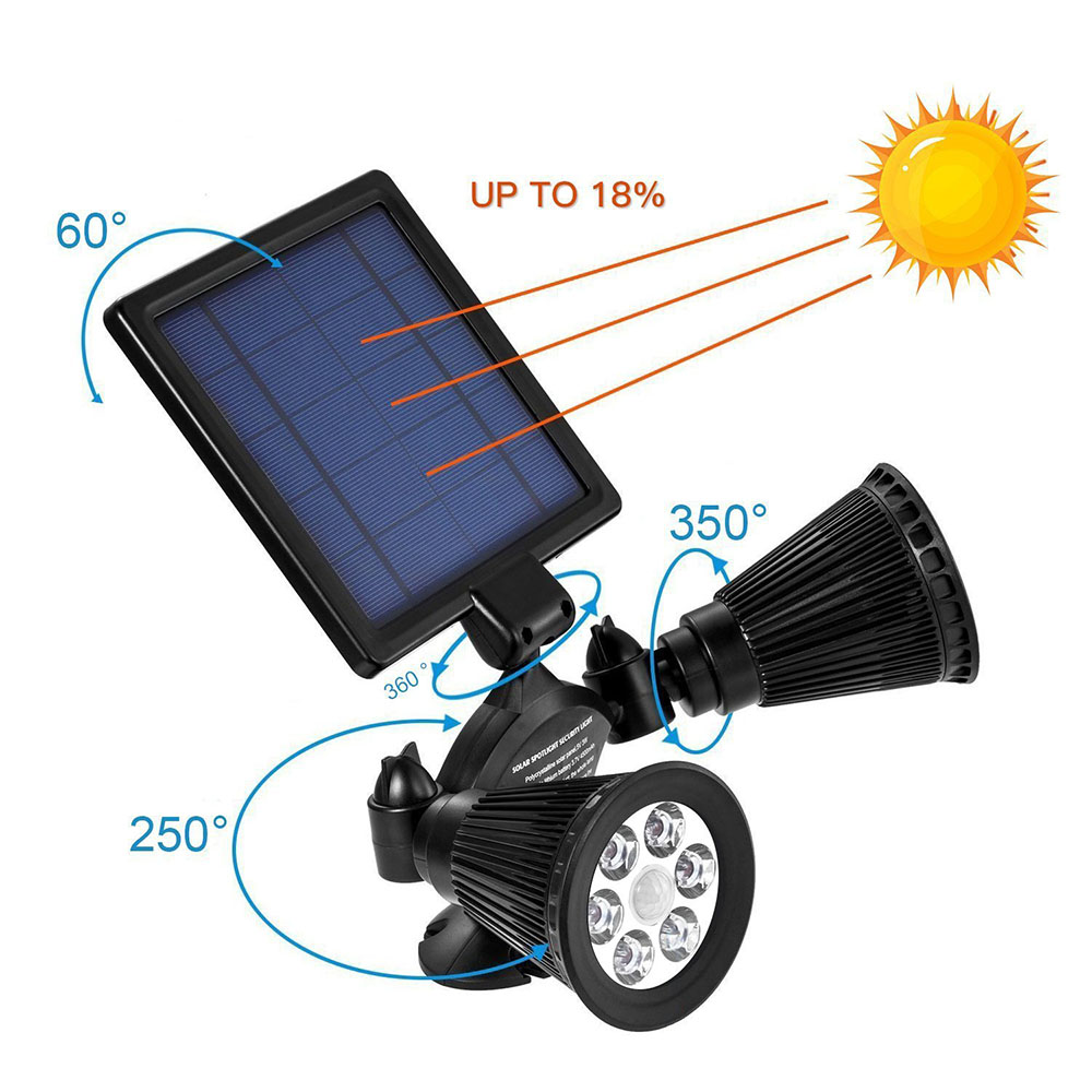 Double lamps on the two sides of the spotlights with 6 LED*50 Lumen in each one. No darkness dead corner with 90°solar panel and twin 360°rotatable spotlights. It can be independently flexibly rotated, set lighting to any angle you want.