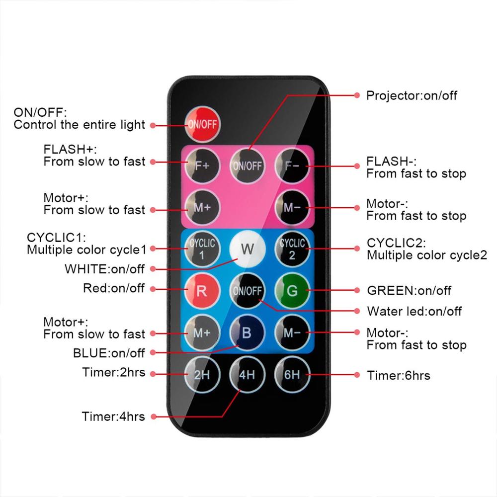 •REMOTE CONTROL - Multi-functional remote control (Battery Included) has a range of 50 feet. Choosing either water wave or slides projection mode or both of them; Changing different colors and speed of the water ripple light; Setting a timer for lights, can meet any of your needs.
