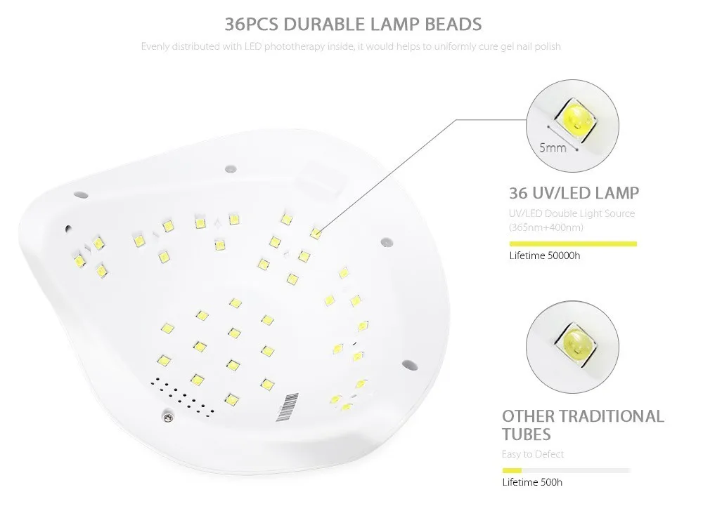 36pcs LED beads widely spread inside, dual light source 365+4025nm can cure 99% kinds of gel polish on market