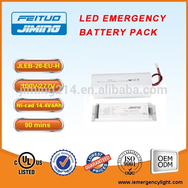 | Model JLEB-72-US Features: LED Emergency Battery Pack for LED Model-JLEB series(72W, Internal battery pack) JIMING LED emergency battery pack will operate LED lighting fixtures between 3-40VDC including LED panel, LED down light, LED ceiling light and the other LED fixtures with external AC drivers not exceeding 44W(JLEB-44 series) or 72W(JLEB-72 series). The LED lighting will be illuminated, at reduced output, for a minimum of 90 minutes. JIMING also provide a high lumen solution (JLEB-20-H) which can operate LED tube light, LED bulb and the other lighting fixtures need a high lumen output, not exceeding 20W. The LED lighting will be illuminated, at 100% output, for a minimum of 90 minutes. TECHNICAL DATA: Mode of Operation: Maintained Input Voltage: 100~277VAC 50/60HZ Input power: 5.5W Battery: 6V 4000mAh Nickel Cadmium Battery(Internal) Output voltage: 3-40VDC Output current: <400mA Lumen output: 15% Lamp used: 72W LED tubes or Down lights(Please Refer to Supplier) Operating Temperation: 0℃~40℃ Charger: Solid-state Electronics Provide High Reliability with Trickle Charge-Facility. Indication: Red LED Backup time: ≥90minutes Recharge time required: 24hous Protection: Low-Voltage Cut-Off to prevent Over-Discharge of Battery The JLEB series Emergency Ballasts for LED Model allow the same lighting fixture to be used for both normal and emergency operation. In the event of a power failure, the JLEB switches to the emergency mode and operates the LED tubes or Down lights for a minimum of 90 minutes. The unit with an external battery, charger and inverters IN A SINGLE PACKAGE. The JLEB can be mounted in the wireway or on the top of fixture. And UL, cUL certificate is pending. | ||||||