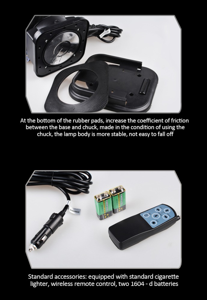 5.combination:Onboard the searchlight+wireless remote control +55w hid xenon lamp+ballast + strong magnetic base+ waterproof cover(12 v) only