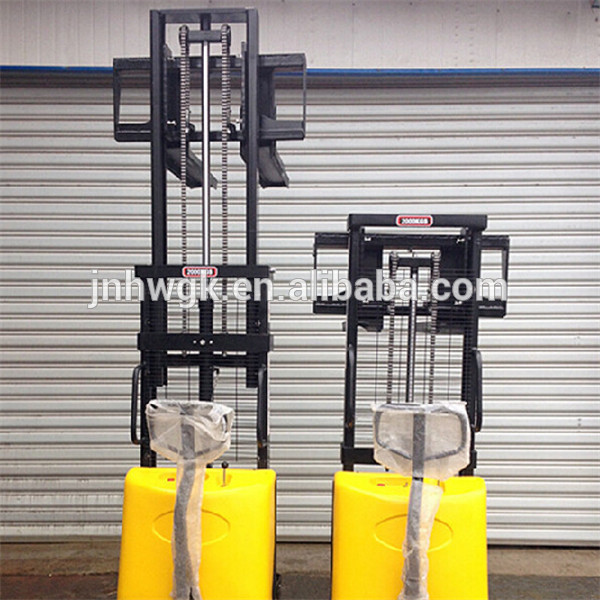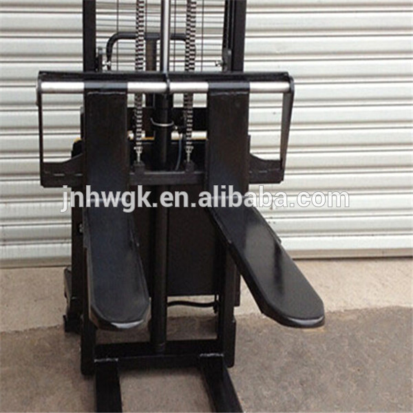 Works semi-electric stacker lift when the lift rod through the manipulation, control pump station, drive straight through the inner cylinder, an outer door frame and the carriage relative motion, so that the forks rise and fall. Semi-electric Stacker push through human walking, use special technology nylon or polyurethane wheels, wear, pressure, mute manual control, flexible operation, light. Steering steering handle manipulated by the steering mechanism acting on both sides of the steering wheel is rotated more lightweight, flexible, therefore, turned directly to the steering handle to the required angle. Parking brake by foot brake operation, the brake acts directly on the caster, brake brakes immediately play the role.