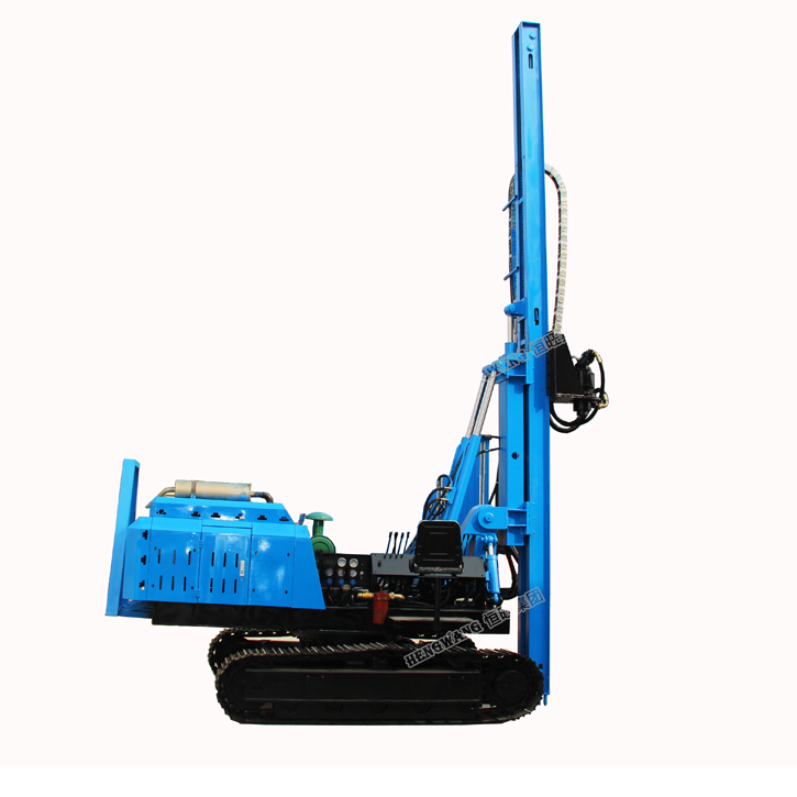 Adopting unique construction technology and climbing design, the rig track can be adjusted according to the grade of the slope to adapt to the maximum 45 degree sloping photovoltaic construction. This equipment can be used for the current PV construction of the piled pile, spiral hole, down-the-hole hammer, impact pile. Such as the construction of various processes, the hydraulic components of the equipment are imported from Europe and the United States, which greatly improves the performance and stability of the equipment; the rig is compact in structure, and the propulsion carriage has a telescopic compensation function. When drilling, the carriage is supported on the ground and drilled. The hole stability is good. The drilling rig has reliable performance, high drilling efficiency and diversified working conditions. It is a powerful guarantee for the construction unit to reduce costs and improve efficiency. This equipment is the most powerful mountain PV rig in China.