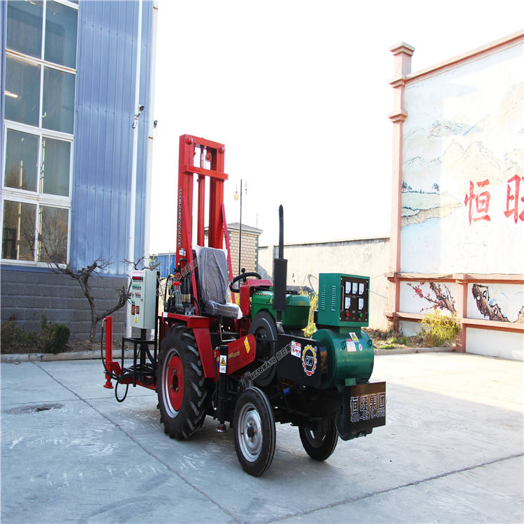 Tractor positive circulation water well drilling machine modified on the tractor is a kind of new drilling machine developed by Hengwang Machinery. It adopts the form of electric motor and carries the generator on the tractor head to solve the problem of no electricity in the field. Three-phase power can be used for customer convenience. The positive and negative cycle drilling machine can use positive or reverse circulation according to different formations, and the gearbox adopts high and low gear shifting.