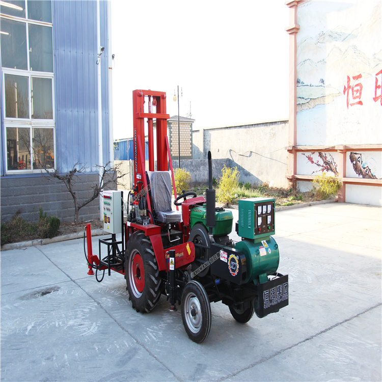 Tractor positive circulation water well drilling machine modified on the tractor is a kind of new drilling machine developed by Hengwang Machinery. It adopts the form of electric motor and carries the generator on the tractor head to solve the problem of no electricity in the field. Three-phase power can be used for customer convenience. The positive and negative cycle drilling machine can use positive or reverse circulation according to different formations, and the gearbox adopts high and low gear shifting.