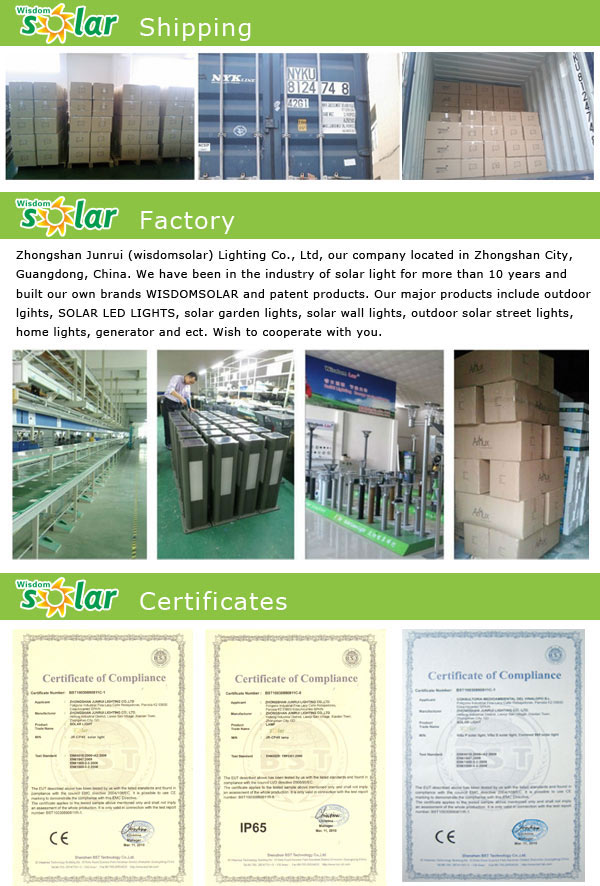 It is located in Zhongshan city known as the lighting capital of China.Founded in 2002.Our Company have developed about 200 types solar lights which suit to street,garden,square,community.These solar products are the perfect combination with the LED light source to achieve high brightness,energy saving, highefficiency, longlife span, zero emission.JunRui Company have access to import and export rights which recognized by PRC,and complied with ISO9001: 2000 international quality system certification ,the solar panel have pass the UL, TUV, IEC61215, CE those authority certification,we also are one enterprise who participated in drafting solar street light quality standards of Guangdon Province. |