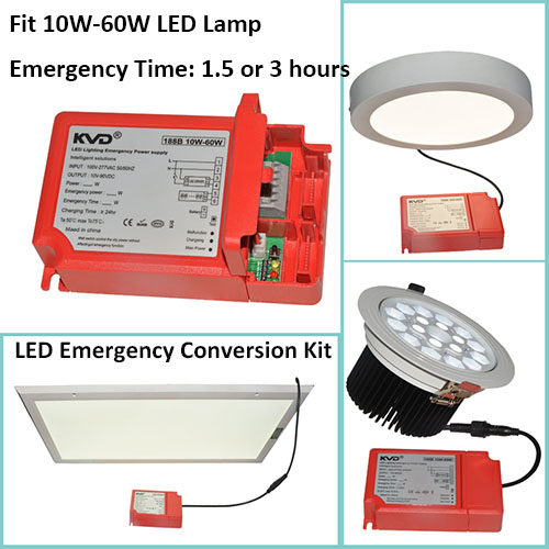 LED 10-60W lights lighting fixture emergency coversion Kit battery backup power 1.5 hours or 3 hours customizable.