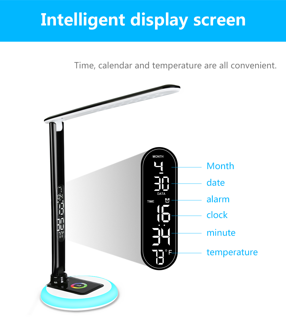 office metal led desk lamp led dimmable touch 3 level foldable rotation rgb table light with calendar temperature alarm clock