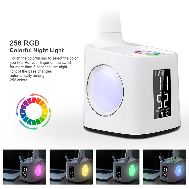 2019 Phone&pen holder colorful charging light flexible led eye protection desk table lamp with alarm/clock