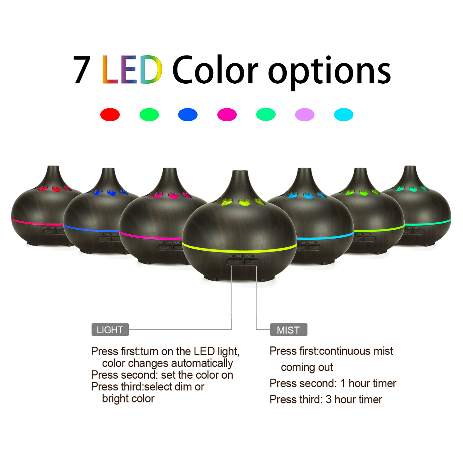 - Waterless auto-off, 7 color LED light