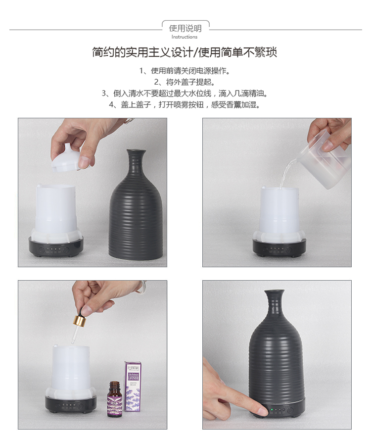 3.This diffuser&humidifier can be worked both water and essential oil mixed used as Aroma diffuser.