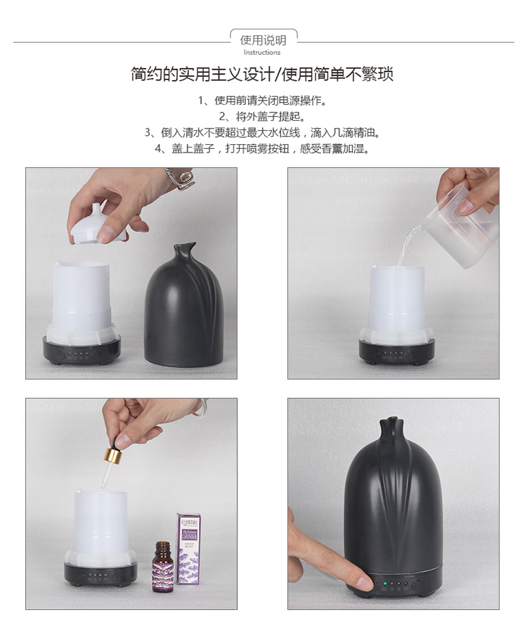 3.This diffuser&humidifier can be worked both water and essential oil mixed used as Aroma diffuser.