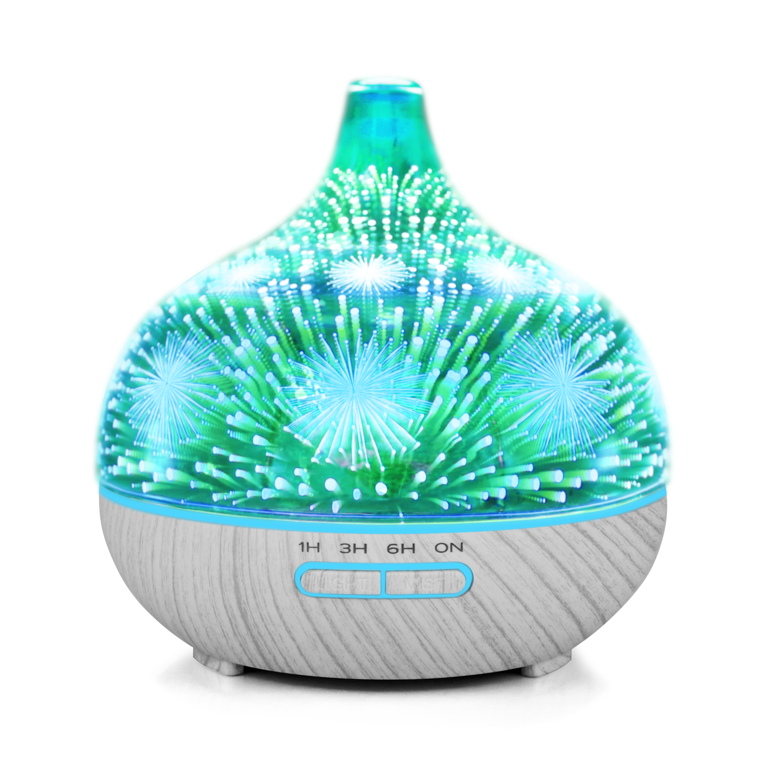 Wood Grain Base Beautiful Fireworks Design 3D Glass Essential Oil Diffuser Humidifier with Remote Control