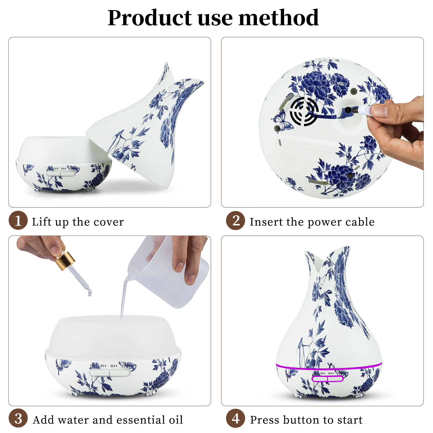 Antique Chinese Blue and White Porcelain Flower Diffuser, Essential Oils 400ml Diffuse with 7 color Led Change