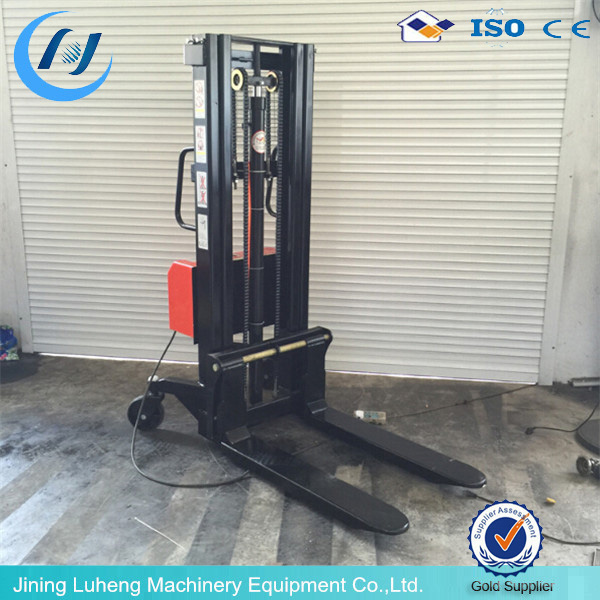 Works semi-electric stacker lift when the lift rod through the manipulation, control pump station, drive straight through the inner cylinder, an outer door frame and the carriage relative motion, so that the forks rise and fall. Semi-electric Stacker push through human walking, use special technology nylon or polyurethane wheels, wear, pressure, mute manual control, flexible operation, light. Steering steering handle manipulated by the steering mechanism acting on both sides of the steering wheel is rotated more lightweight, flexible, therefore, turned directly to the steering handle to the required angle. Parking brake by foot brake operation, the brake acts directly on the caster, brake brakes immediately play the role.