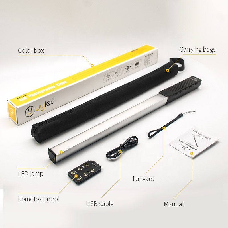 Packing list: Color box, carry bag, LED Lamp, remote control, USB cable, user manual, lanyard