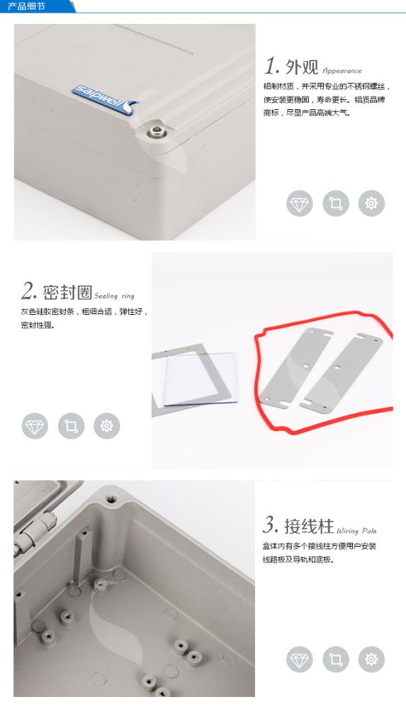 - SAIPWELL High OEM/ODM CE RoHs IK08 IP 66 aluminum electrical cabinet box main switch waterproof enclosure with clear window packing: 1 SAIPWELL High OEM/ODM CE RoHs IK08 IP 66 aluminum electrical cabinet box main switch waterproof enclosure with clear window in a box.
