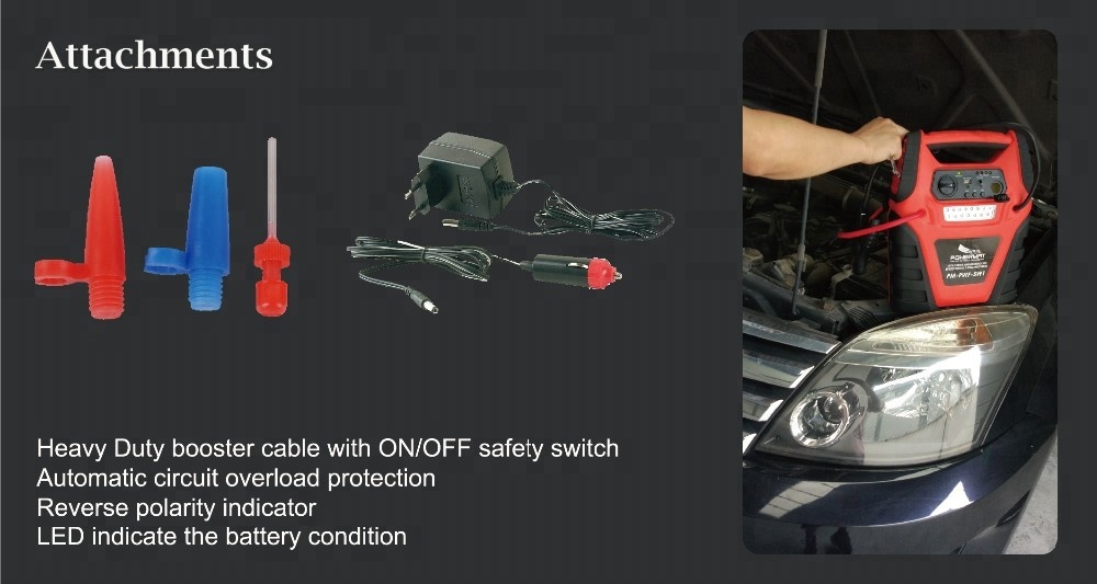 TMSPL-16 | 3 in 1:Jump starter/LED worklight/Air compressor Heavy Duty booster cable with ON/OFF safety switch 12V 17AH Sealed-lead-acid rechargeable battery Automatic circuit overload protection 250PSI air compressor 15pcs LED worklight 1 DC 12V output socket,1USB plug, Reverse polarity indicator LED indicate the battery condition included AC/DC charging adaptor | color packing/pc,mean/pc:31*15*35cm 2 pcs/ctn Means/ctn:34*32*37cm GW/NW:12/11kg 20"Q-640ctns-1280pcs 40"Q-1350ctns-2700pcs |