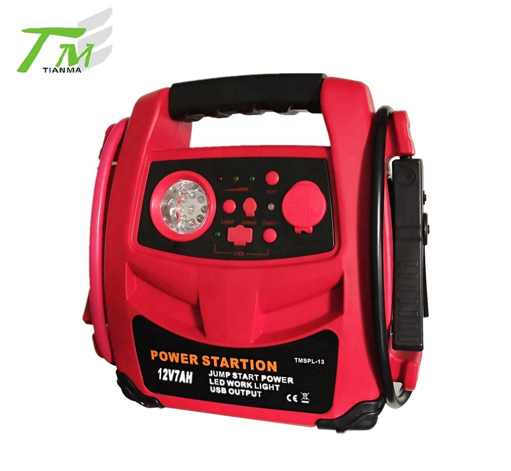 TMSPL-13A | 2 in 1:Jump starter/LED worklight ON/OFF safety switch 12V7AH lead acid battery safety switch, overload protection, overcharging protection 9pcs LED worklight 1 DC 12V output socket,1*5V USB, Reverse polarity indicator LED indicate the battery condition included AC/DC charging adaptor | color packing/pc, 3 pcs/ctn Means/ctn::38*27*27cm GW/NW: 20'Q-964ctns-2892pcs 40'Q-2000ctns-6000pcs |