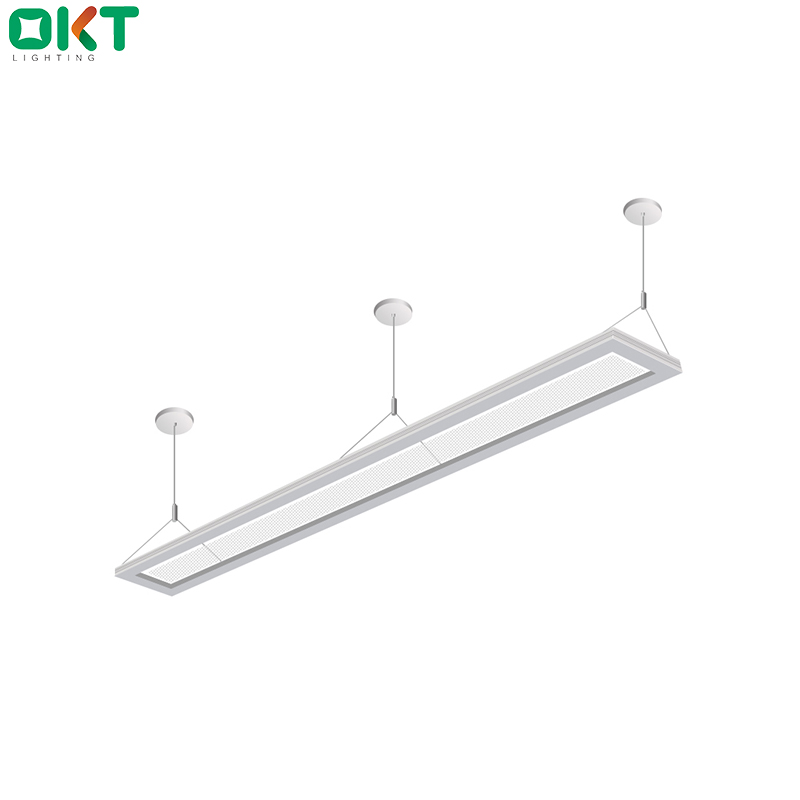 OKT 4inch x 8ft suspended Up/Down led panel light is a commercial pendant lighting fixture utilizing an advanced LED optical system to achieve superior performance. The unique design is nearly transparent luminaire when off and excellent uniformity and efficiency when on, reaching 55% downlighting and 45% uplighting distribution, making the illusion of the light floating in mid-air, included UL Recognized constant current driver which support 0-10V dimming, suitable for indoor lighting.