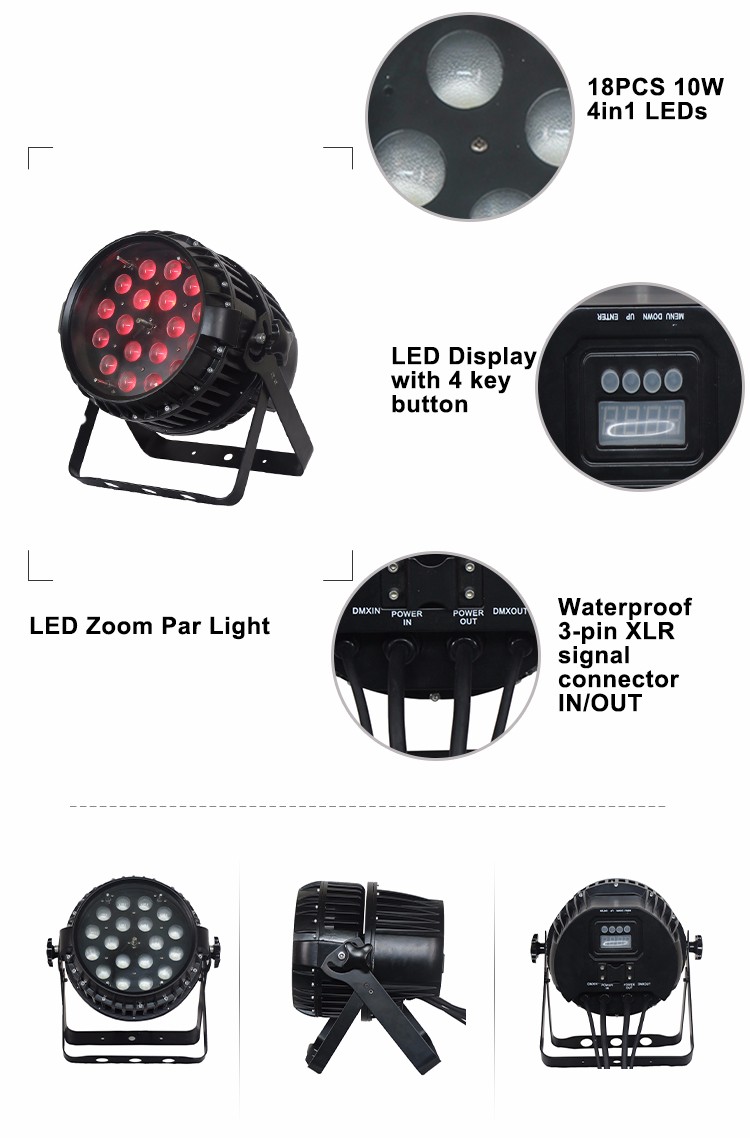 The LED focusing head light has a water-proof factor of IP65, an adjustable angle of 8° to 50°, and 18 10W 4in1 LED beads. The product has high brightness, pure color mixing and no flicker. It combines the characteristics of dyeing lamp and beam lamp. This product is specially designed for outdoor, concert, mobile performance, night club, bar and so on.