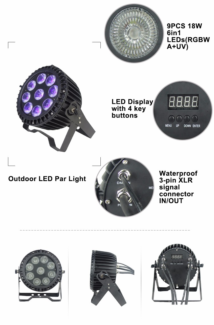 LEDPAR 918 is designed for outdoor applications, IP65 waterproof factor, small size, light weight, using 9 18W 6 in 1 LED lamp beads (RGBWA+UV), high brightness, no noise, no flicker. The product is available in 2 channel modes, 6 channels and 10 channels. The product is suitable for small concerts, TV studios, bars, nightclubs, outdoor lighting and so on.