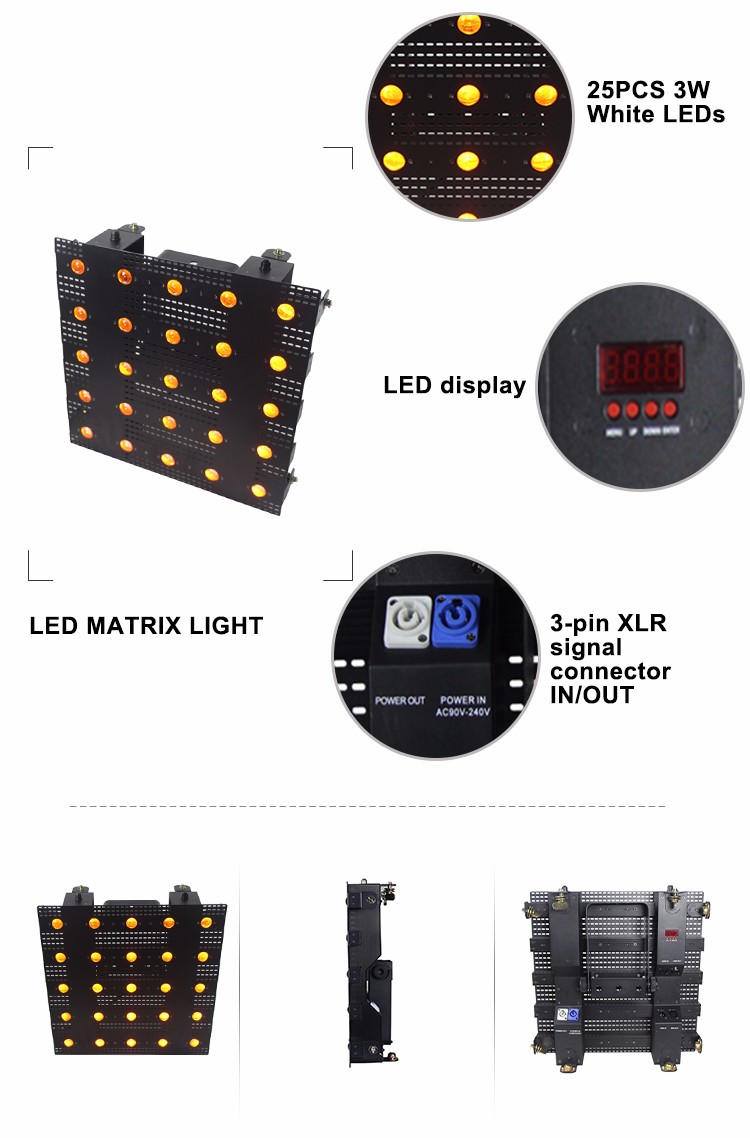 The MATRIX 3253 is a high-end LED beam matrix light that creates magical lighting effects. The product uses 25 3W white LED lamp beads, each of which is individually controllable. It has 4 channel modes for easy use or professional programming to display numbers, letters, patterns or image effects. Products can be controlled by DMX 512 control or professional computer software for large concerts, studios, studios, mobile shows, clubs, bars and more.