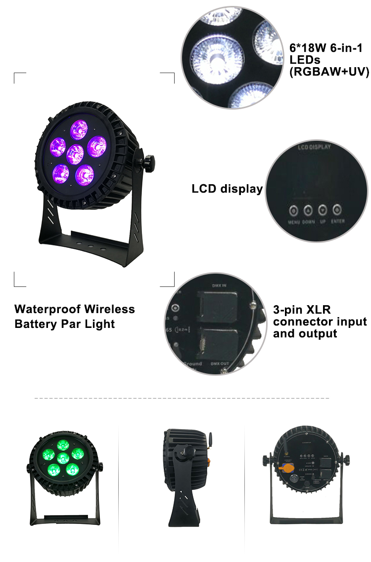 OUTDOOR WIRELESS BATTERY PAR 618 is a new IP65 waterproof PAR lamp with a small size, large battery capacity, long service life, full-featured, built-in waterproof wireless DMX system, plug-in waterproof power connector and signal connector. Flexible and convenient to use. The product uses 6 18W 6 in 1 LED lamp beads, with 25° high-definition optical lens (35° projection angle), high brightness, smooth dimming and pure color mixing. Products can be controlled by wireless DMX, traditional DMX control, infrared remote control, master-slave control, voice control, and mobile/tablet APP control. The product has two channel modes and built-in preset scenes to meet different application needs and different user needs. This outdoor battery PAR lamp is suitable for flow-type light-emitting applications, such as wedding venues, aluminum frame dyeing, small and medium-sized mobile performances, outdoor lighting and so on.