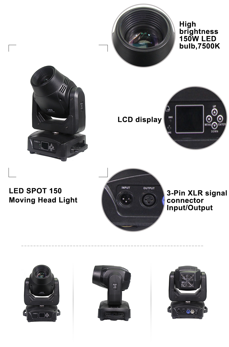 LED BSW 150 uses a high-brightness 150W LED lamp with 7500K color temperature. Pan and Tilt scanning speed is fast , low noise, high precision. The product features a full range of functions, including a rotating gobo wheel (7 gobos + white), a fixed gobo wheel (8 gobos + white ), a color wheel (8 colors + white), a 4-facet round prism, electric focus,and zoom lens, 0-100% linear LED dimming, different speed strobe effect. The product is suitable for small and medium concerts, KTV, performances, stage, hall and concerts.