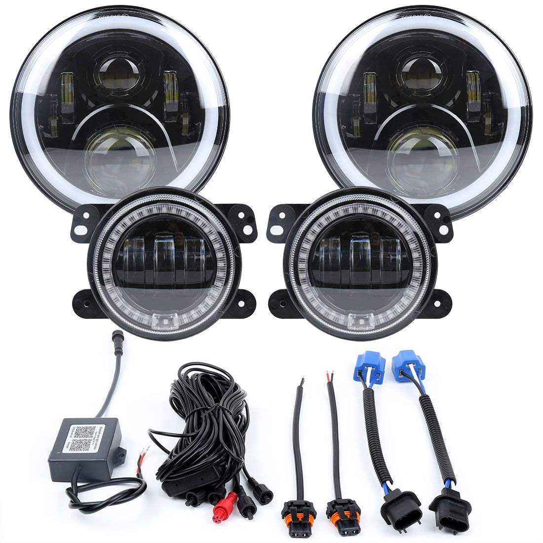 · Package include: 2 x 7” RGB Headlights, 2 x 4” RGB Fog Lights, 1 x controller wire harness, 2 x H4 to H13 adapter for Headlight, 1 x App Instruction. (Note: If you meet flicker or high beam issue, please add a set anti-flicker harness)