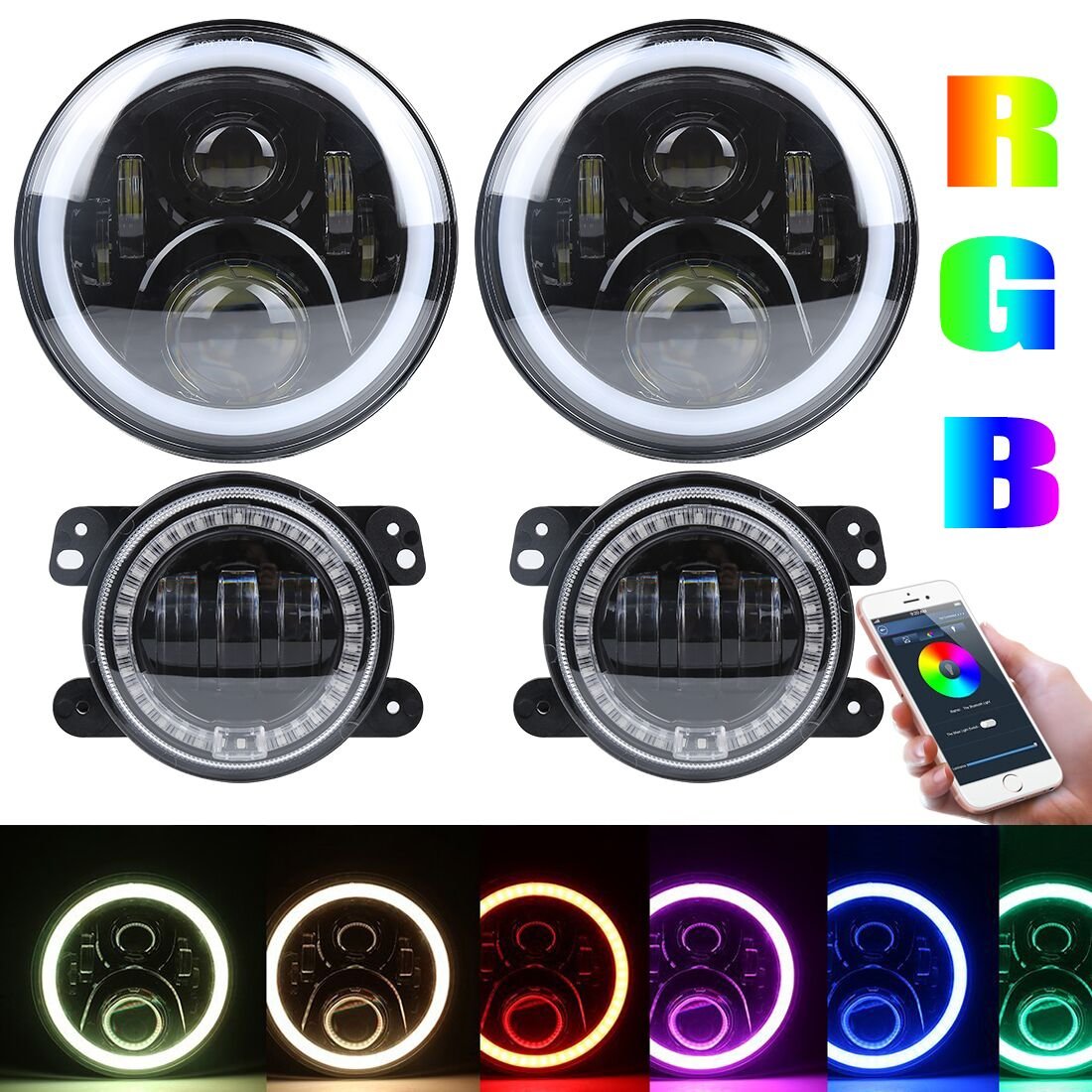 · Jeep Wrangler 7" Round RGB LED Headlamp + 4” RGB LED Fog Lamps replaces original halogen and HID headlight, Maintenance Free. Newest Fantastic Design LED Headlight with RGB Halo Ring.