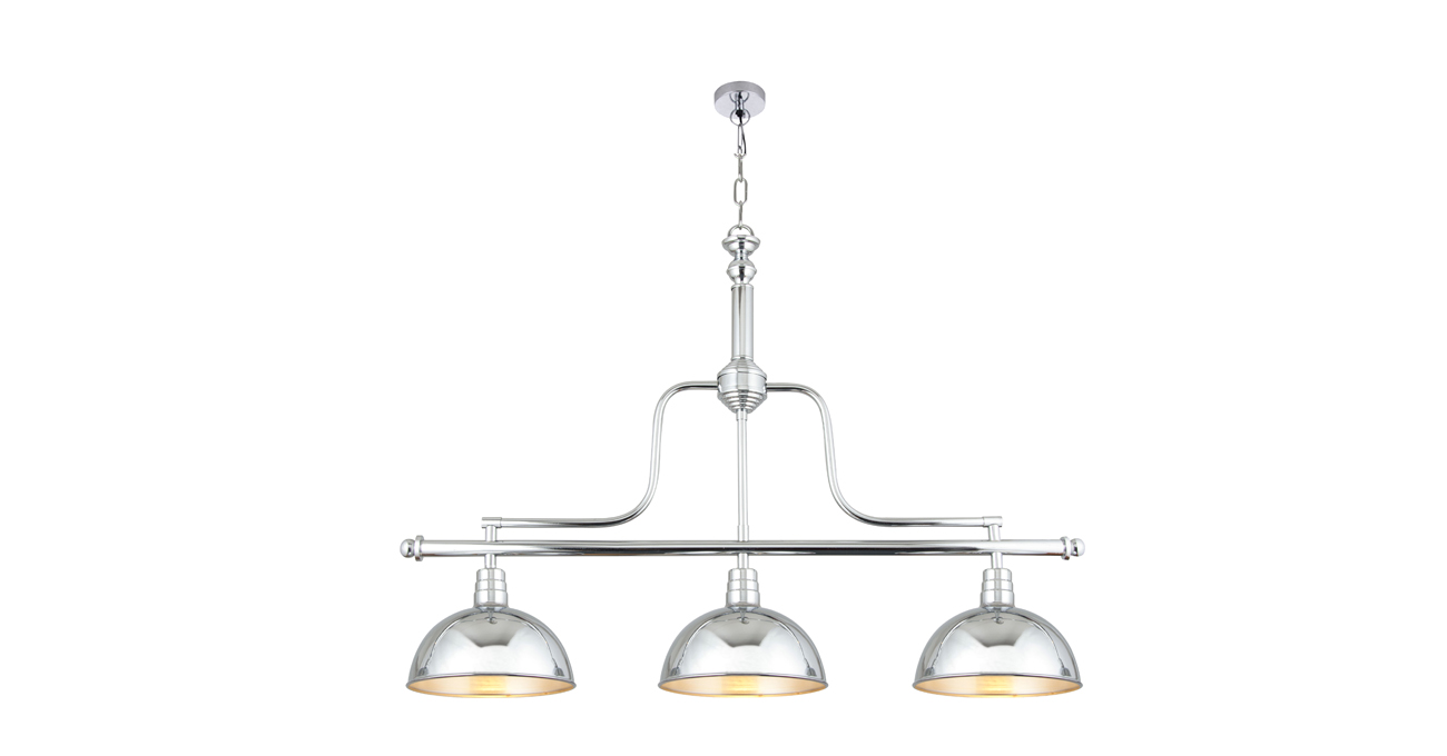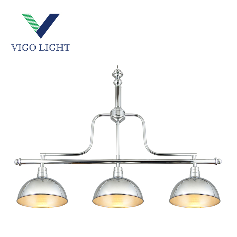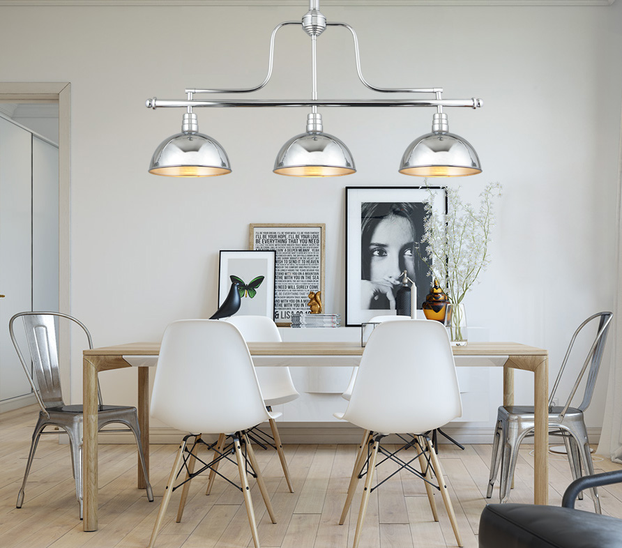 This pendant with three heads is made of iron. The outer finish of it is chrome electroplated, and the interior finish of the lampshade is white. The suspension height of the lamp body can be adjusted by changing the length of the chain. It is suitable for restaurant and other places.