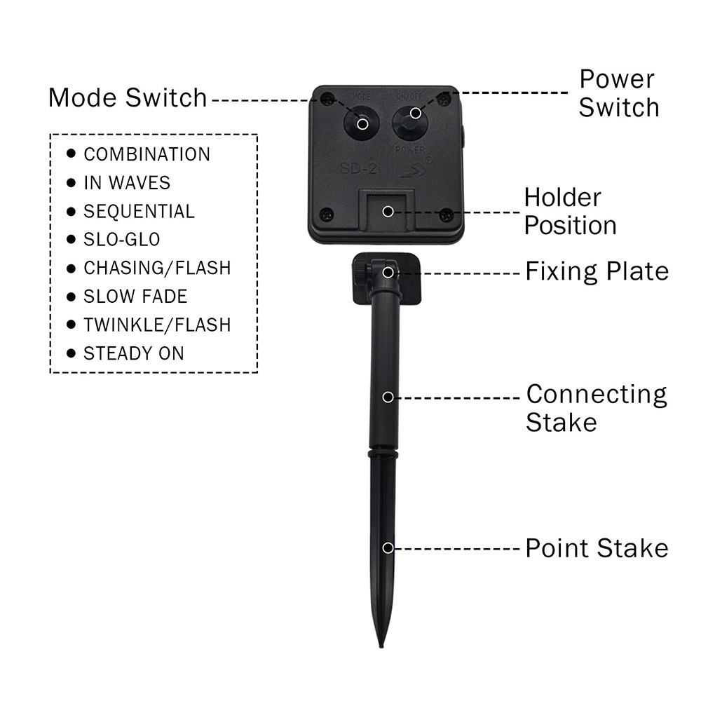 | Power: | Solar panel:2V,150mAh,battery:1.2V,800mAh-1200mAh |