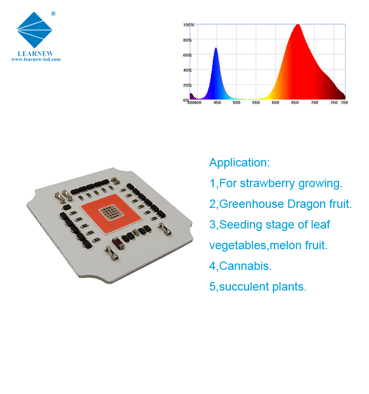 Learnew's grow light led cob features a flip-chip design of full-spectrum growth lights, and the mature phosphor technology. This product it has the characteristics of low thermal resistance, high spectrum, high efficiency and PPF, etc.