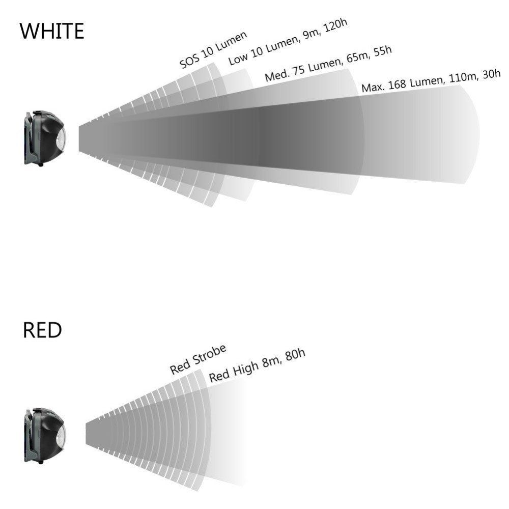 1. The headlamp Brightest can reach up to 168 lumens and 110m with latest CREE XP-E Led , which can make you see clearly at night.