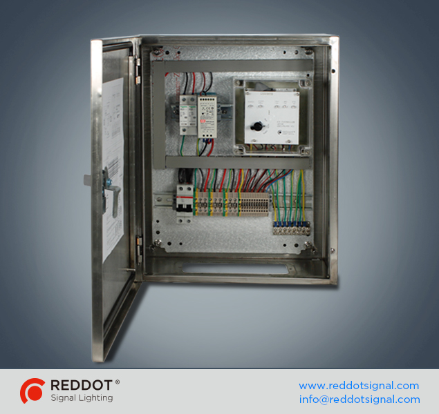 RedDot controller CB3 is used for controlling a monitoring RedDot LED aviation obstruction light. With the friendlier interface and easy-to-set switches for multifunction. With DIN rail terminal blocks, this controller comes with circuit breaker and surge protector to protect obstruction lighting system against over-voltage and lightning strike.