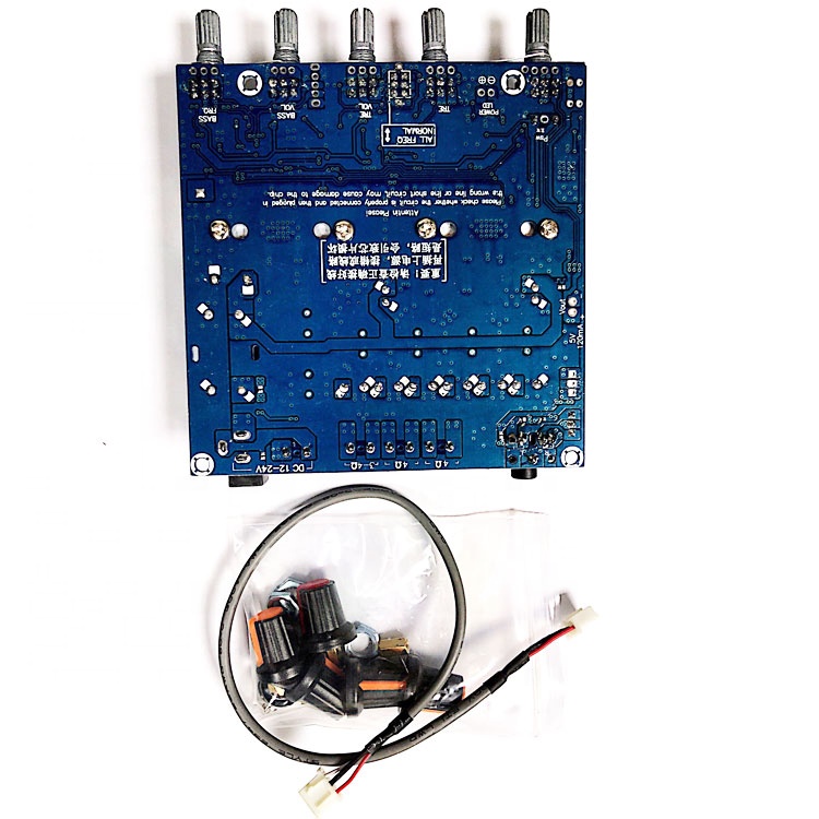 - With external audio source input interface, with front stage amplifier, bass frequency division processing;Bass volume, bass frequency, left and right channel volume, treble, switch/total volume, 5 adjustable potentiometers.