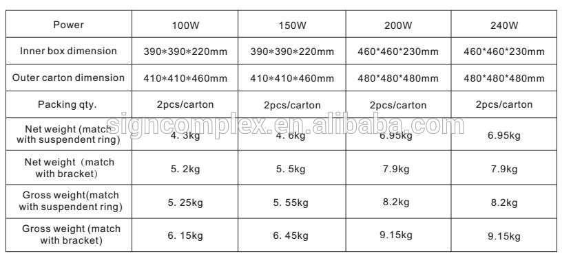 | Power | 100W | 150W | 200W | 240W |