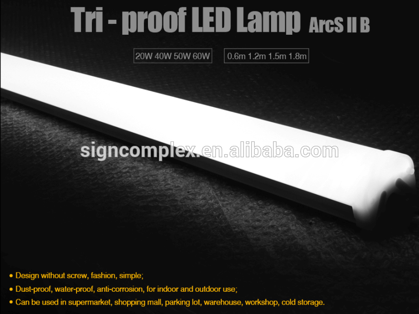 Tri-proof light of medium power can be used in warehouse, parking lot,shopping mal l,farm,food factory, cold storage, metro, underground passage and other places.