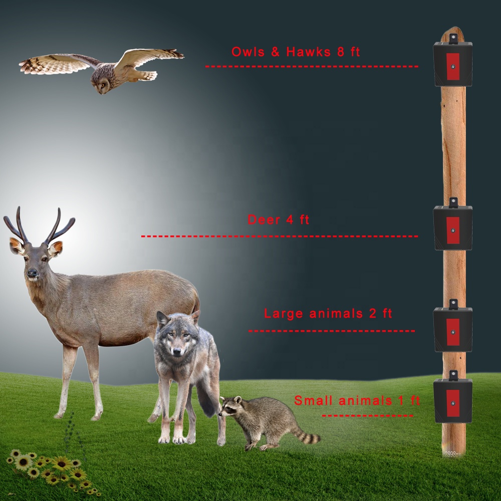 5.Suggestion -- Mount the lights at eye level of the animal you are trying to deter. For maximum protection we recommend that 4 or more units are deployed to offer 360 Degree coverage.