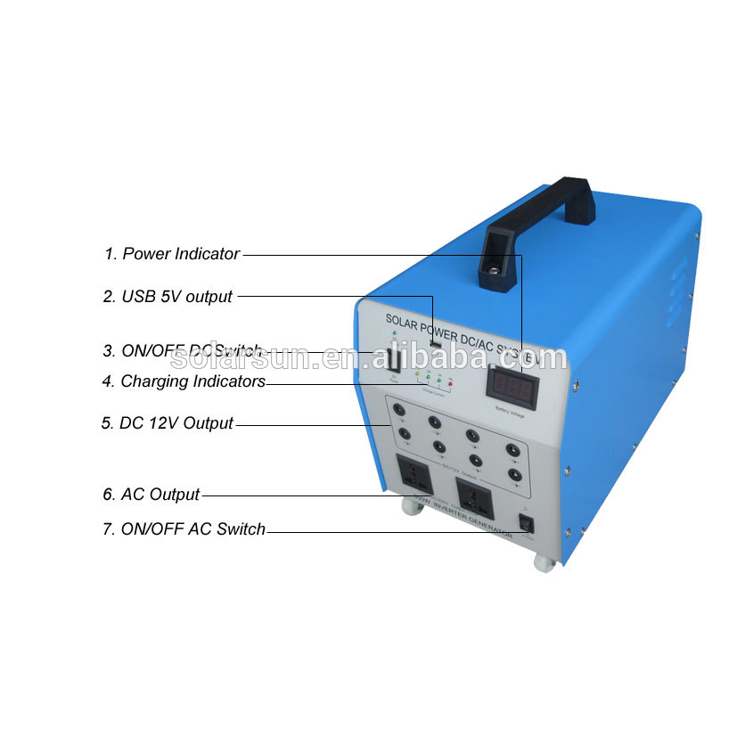 | Lighting time | more than 7 hrs lighting time Load 4pcs 5W LED lamp, 10W DC standing fan and 70W TV, 50w laptop |
